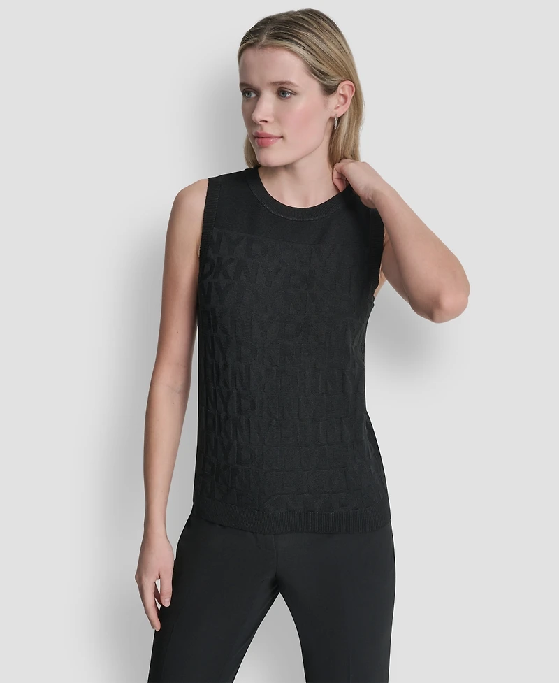 Add casual sophistication to your wardrobe with this Dkny sleeveless sweater, adorned with an all-over logo print. The classic crewneck makes it a versatile staple for relaxed settings.