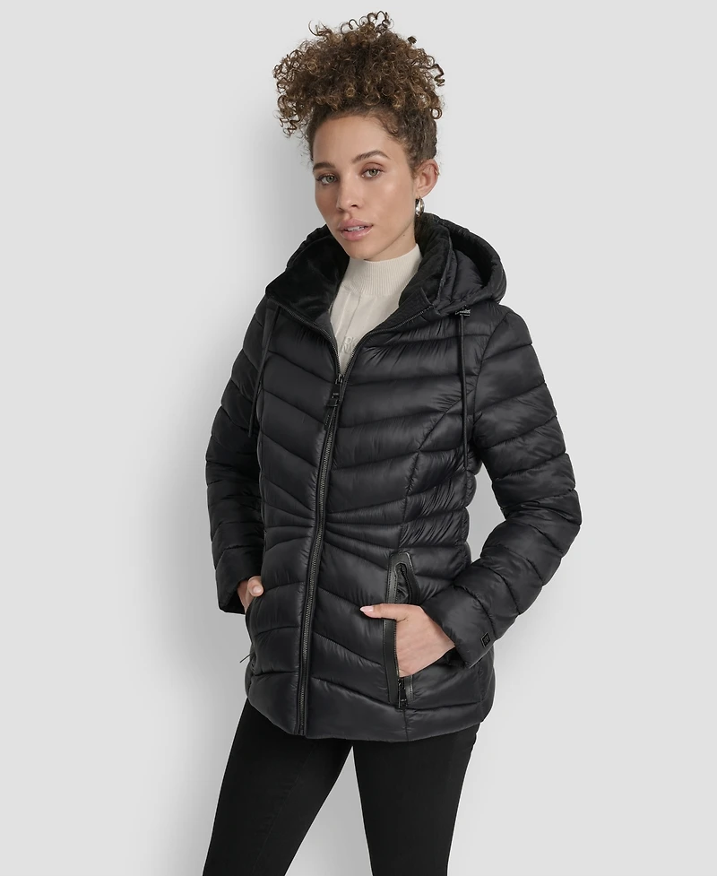 Offering a streamlined silhouette, this Dkny coat ensures reliable coverage and sophisticated style. A stand collar and full zipper front create a polished, versatile look.