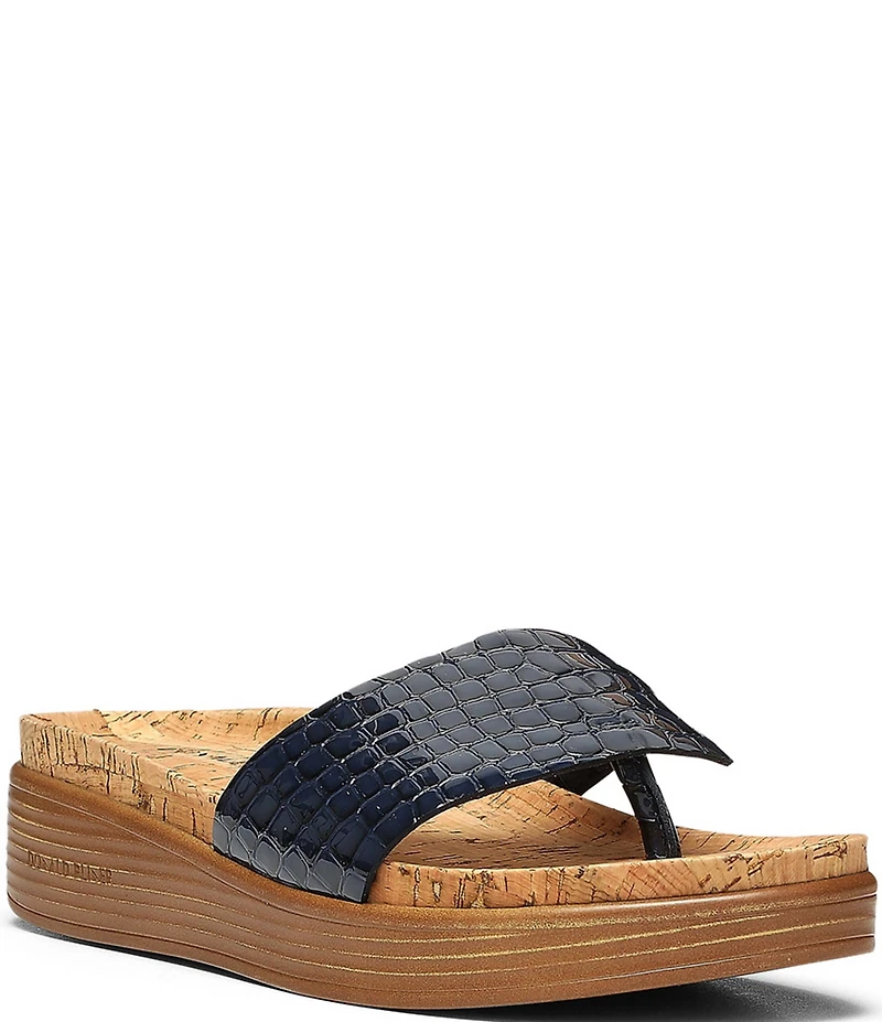 From Donald Pliner, the Fifi Crocodile Patent Leather Platform Thong Sandals feature: Crocodile embossed patent leather upper Slip on with a toe post for stability Leather lining Cork footbed Extra padded footbed for support and comfort Rubber outsole Approx. 0.75" platform height Approx. 1.25" wedge height Imported.