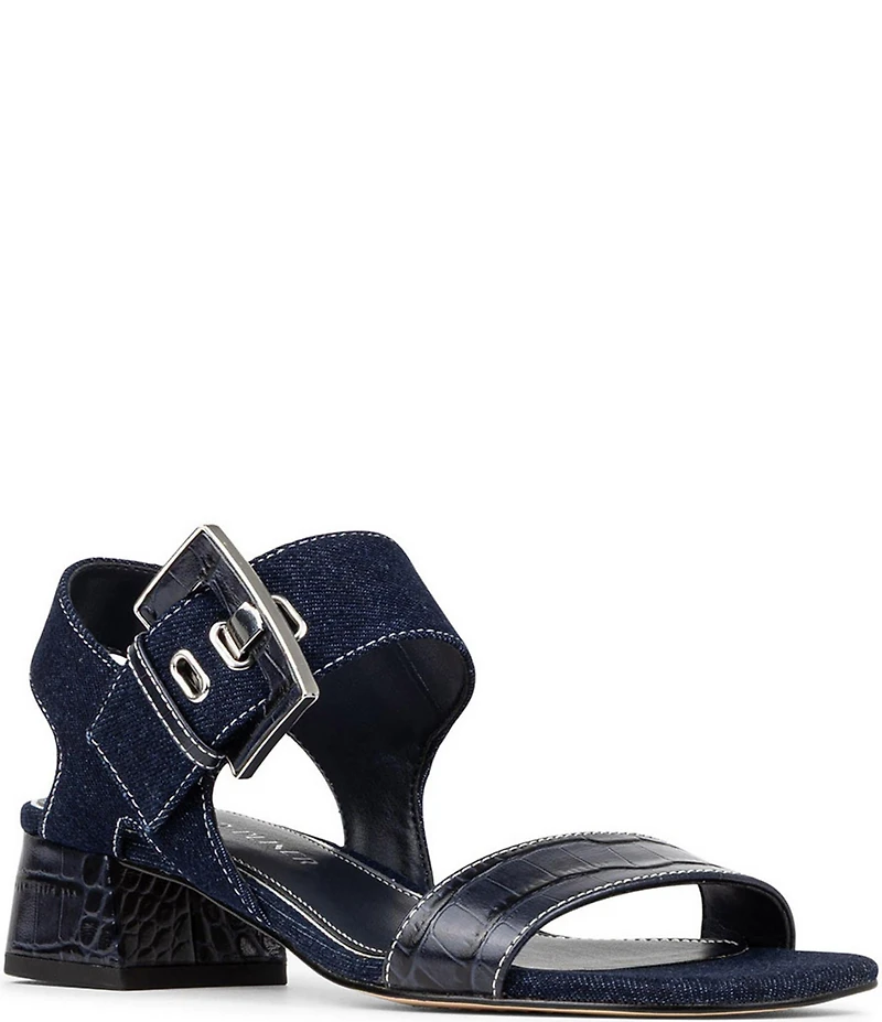 Donald Pliner Vixi Denim and Croco Print Leather Block Heel Dress Sandals
