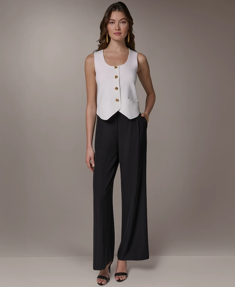 Layer with effortless style in this Donna Karan New York sleeveless sweater vest, highlighting a scoop neckline and button-up front that bring subtle definition. Thoughtful knit construction allows pairing with shirts or dresses for polished transitional styling.