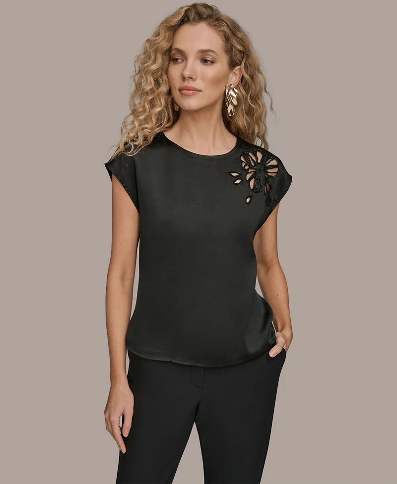 Donna Karan New York Women's Embroidered Cap Sleeve Crewneck Top