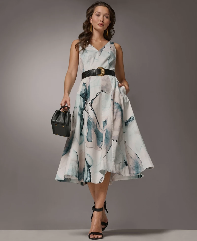 Bring energy to your wardrobe with this Donna Karan New York midi dress, designed with a vivid print for a modern dimension. The V-neck and sleeveless cut enhance its chic and versatile appeal.