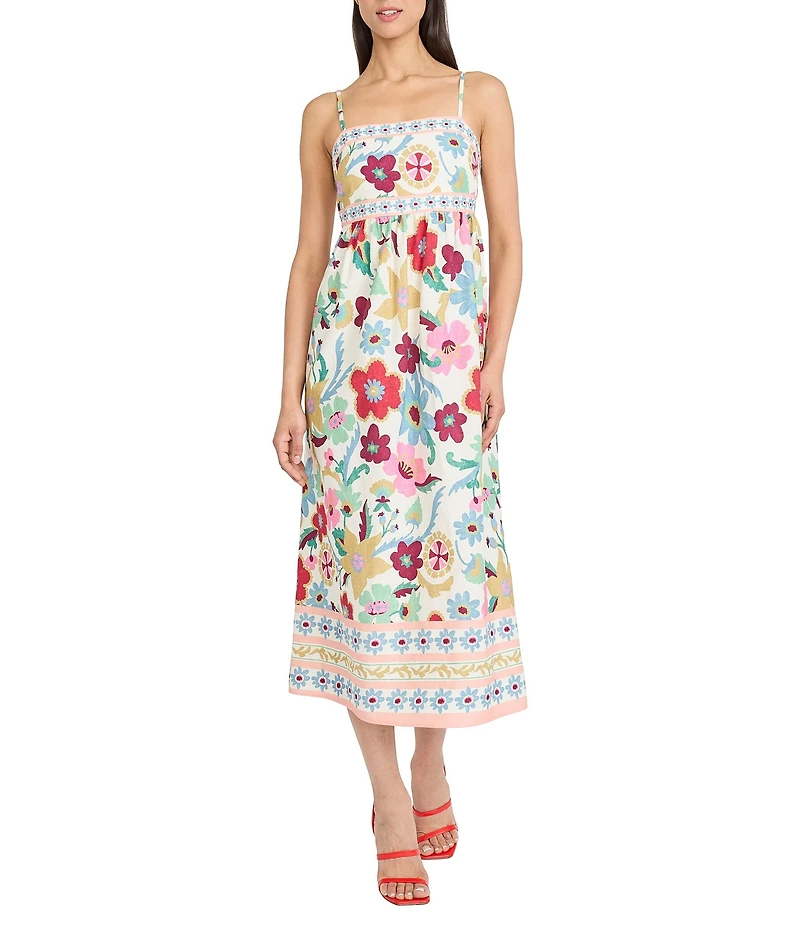 Donna Morgan Floral Print Linen Blend Sleeveless Square Neck Midi Dress