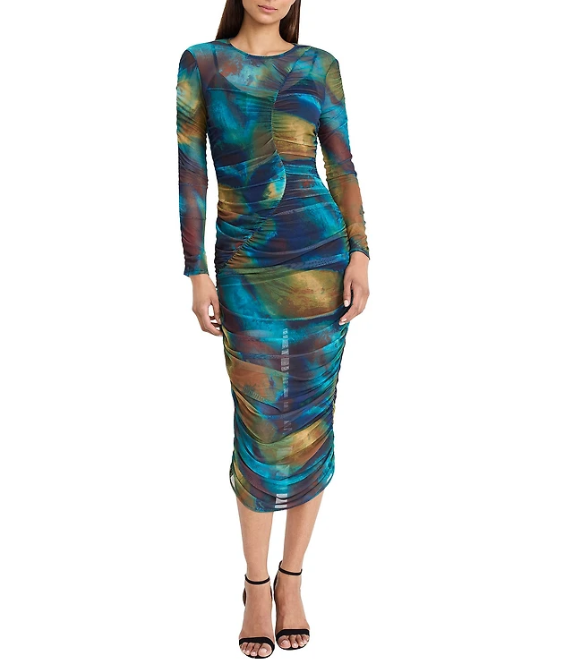 Anne Klein Floral Printed Mesh Crew Neck Long Sleeve Side Ruched Midi Dress
