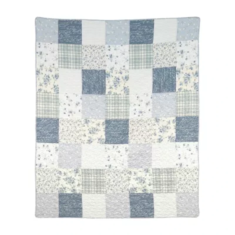 Blue Pastures Cotton Quilt Collection from Donna Sharp brings a sense of comfort and serenity to the room, as if it were stitched together from favorite memories of quiet mornings and sunlit afternoons. The patchwork design weaves together soft blues, gentle creams, and crisp whites in a balance that feels both fresh and timeless. Each square tells its own little story-some with delicate blossoms that recall spring gardens, others with faded script that feels like letters from long ago, and others with tidy plaids that suggest the ease of country living. This lap quilt feels like an invitation to slow down-to sink into its layers and let the soft patterns calm the senses. The texture adds a touch of warmth and craftsmanship, reminding you that beauty often lies in the details. It's the kind of quilt that makes a bedroom feel not just decorated, but truly lived in-a space where charm, nostalgia, and comfort come together. The reverse side features a soft, airy blue background adorned with a delicate white floral pattern, offering a simpler, more understated look that complements the detailed patchwork front. Machine wash, tumble dry low.