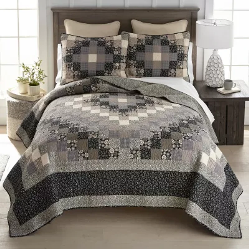 Introducing Donna Sharp Lexington Trip Cotton Quilt Collection, softer more neutral take on our classic trip around the world pattern. The quilt set features a classic trip-around-the-world pattern composed of small, evenly sized square patches arranged in concentric color waves. The color palette blends warm neutrals, soft taupe's, beige, olive, and black, with a mix of floral, checkered, and textured prints adding visual depth. Floral patches are interspersed throughout, giving the design a delicate, vintage touch. The quilt is bordered with multiple coordinating bands: a narrow-speckled border in muted green tones, followed by a wide black border with a leaf-and-vine print, and finally framed by another narrow-speckled edge. The overall effect is cozy, traditional, and rich in detail, making it a perfect choice for a country cottage or rustic-inspired bedroom. Set includes one quilt and two shams (twin has one sham). Machine washable tumble dry low. Also available in a coordinating throw!