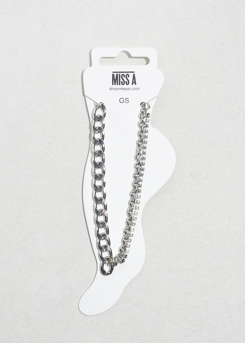 Stylish Double Chain Foot Jewelry Elevate your summer style with this layered silver chain anklet . Featuring a bold chunky curb chain paired with a sleek rhinestone-style chain, this anklet brings the perfect mix of edgy and chic to any outfit. Whether you’re dressing up for a night out, hitting the beach, or adding a trendy touch to your everyday look, this double chain anklet is the ultimate must-have accessory. Trendy layered design with two unique chains for a bold statement Versatile silver-tone finish that pairs effortlessly with any outfit Lightweight and comfortable for all-day wear Perfect for festivals, vacations, beach days, or casual everyday style Add a little sparkle and shine to your step with this fashion-forward anklet . A stylish piece that makes the perfect gift for yourself or a loved one!