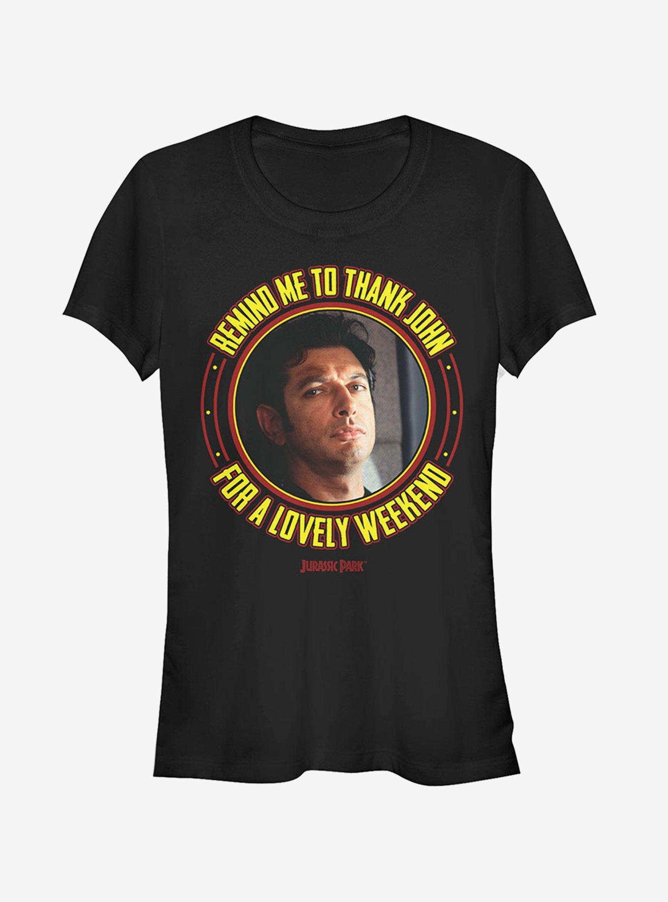 You may not make it out of Jurassic Park in one piece, but at least you got the awesome Jurassic Park Dr. Malcolm Lovely Weekend T-Shirt for your visit! Dr. Ian Malcolm's quote "Remind Me to Thank John for a Lovely Weekend" is printed in a yellow print and encircles a graphic of the beloved chaotician on the front of this funny Jurassic Park tee.