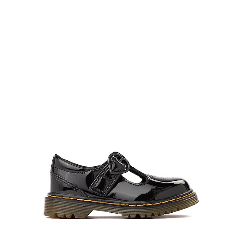 Accentuate their cute style with the new polley ii mary jane shoe by dr. Martens. This adorable mary jane features glossy patent lamper leather uppers with heart-shaped perforations, decorative buckle strap with heart buckle and hidden hook-and-loop closure for easy on and off, and cemented sole construction with signature yellow welt stitching. Available online at journeyskidz. Com.