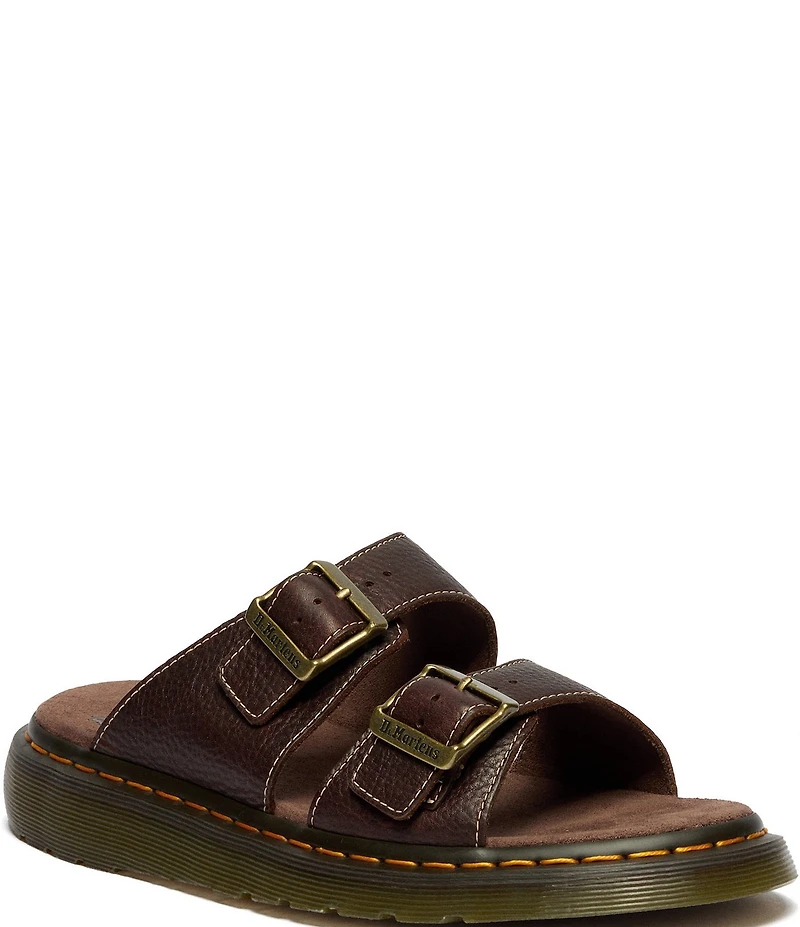 From Dr. Martens, the Women's Josef Grizzly Leather Slide Sandals feature: Grizzly leather upper: A heavyweight leather with a subtle grained finish Slip on design with 2 adjustable buckles Suede covered foam footbed Classic Docs DNA including visible yellow stitching and grooved sides Rubber outsole Approx. 0.98" platform height Approx. 1.57" heel height Imported.