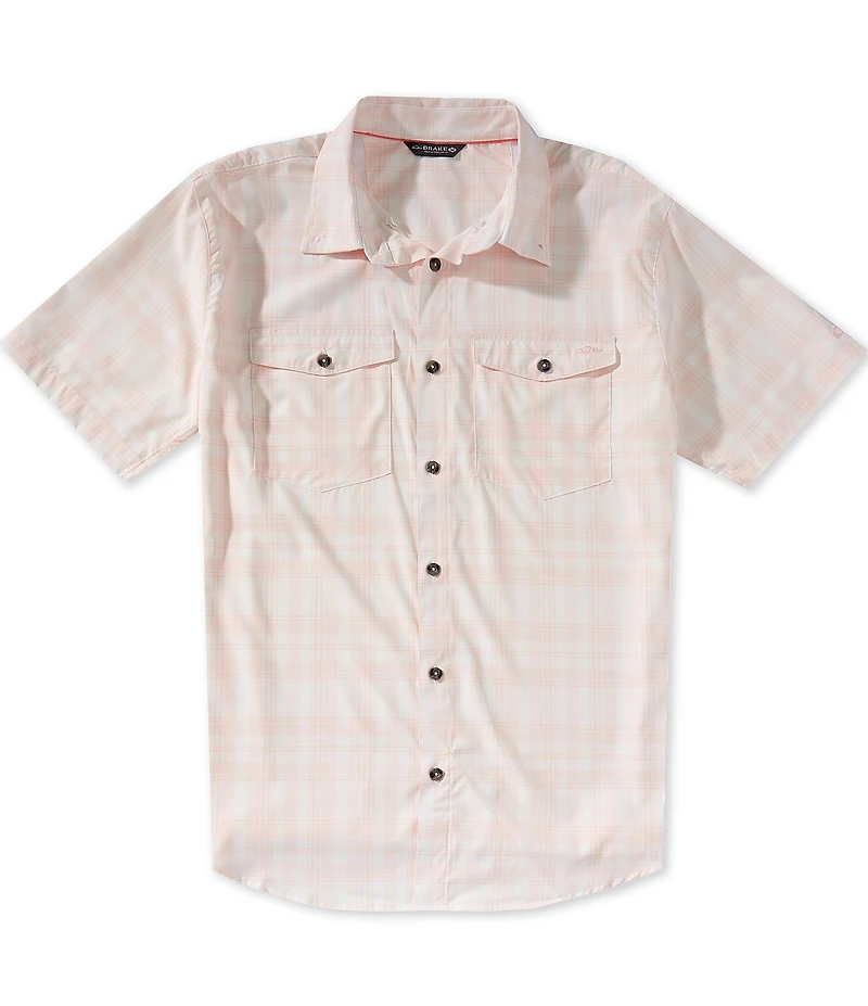 From Drake Clothing Co., this shirt features: Faded-plaid pattern Button-down collar Short sleeves Button-front closure Two button-closure flap pockets Hidden zippered pocket Magnattach™closure behind the left pocket Sculpted hem Built-in sunglasses wipe at the hem Vented cape back Polyester/spandex Machine wash/tumble dry Imported.