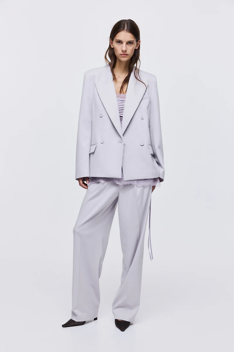 Dress pants in woven fabric. Low waist, concealed button and hook-and-bar fastener, and a zip fly. Diagonal side pockets, one welt back pocket, and straight legs with pleats and creases at front.