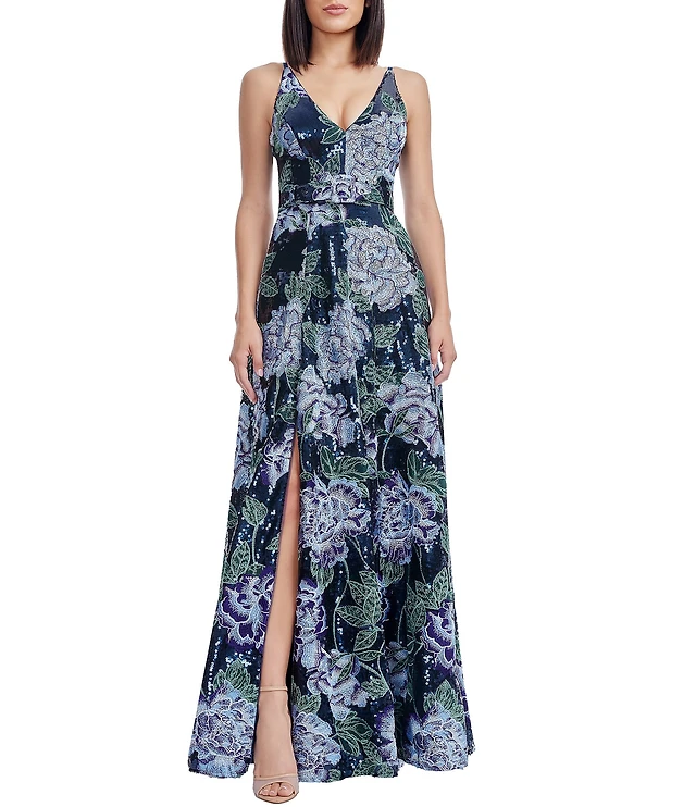 Dress the Population Alyssa V-Neck Sleeveless Floral Embroidered Sequin A-Line Gown