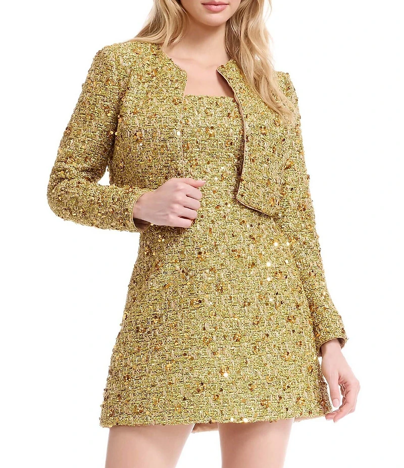 From Dress the Population, this jacket features: Metallic tweed fabrication Cropped boxy silhouette Crew neckline Long sleeves Hook and eye closure Approx. 17.25" length Polyester/Metallic Hand wash cold Imported.