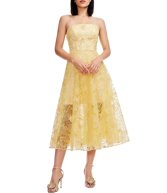 Dress the Population Viviana Strapless 3D Floral Lace Sheath Midi Dress