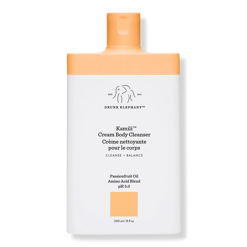 KAMILI CREAM BODY CLEANSER 8 FL OZ 8.0OZ. Benefits: Calms skin while rinsing dirt and other substances away. Won't strip or disrupt delicate skin barrier. Appropriate for all skin, even the most sensitive. Naturally sweet almond scent dissipates quickly. Formulated at a skin-friendly pH of 5.0. Recyclable packaging. Key Ingredients: Passionfruit Oil Commonly known as maracuja oil, it's used for its rich moisturizing properties and skin-soothing benefits. Multi-Amino-Acid Blend A mix of quick-absorbing amino acids soothes, strengthens, and moisturizes skin. Ultra-Mild Surfactant Blend A stack of gentle cleansing agents, including coconut-based surfactants rich in fatty acids, work together to create a creamy foam that effectively lifts dirt and other substances from skin without stripping or drying. Formulated Without: Made without the Suspicious 6 - the six ingredients Drunk Elephant believes are at the root of almost every skin issue (Essential oils, Silicones, Chemical sunscreens, SLS, Fragrances + dyes, and Drying alcohols).