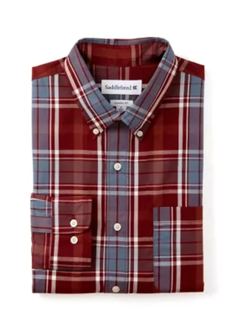 Designed for versatility and convenience, this easy-care shirt from Saddlebred�� dons a classic plaid print for a bold look. Button closure Button-down collar Long button-cuff sleeves 1 chest patch pocket Imported Belk Exclusive Material & Care Polyester, cotton Machine washable