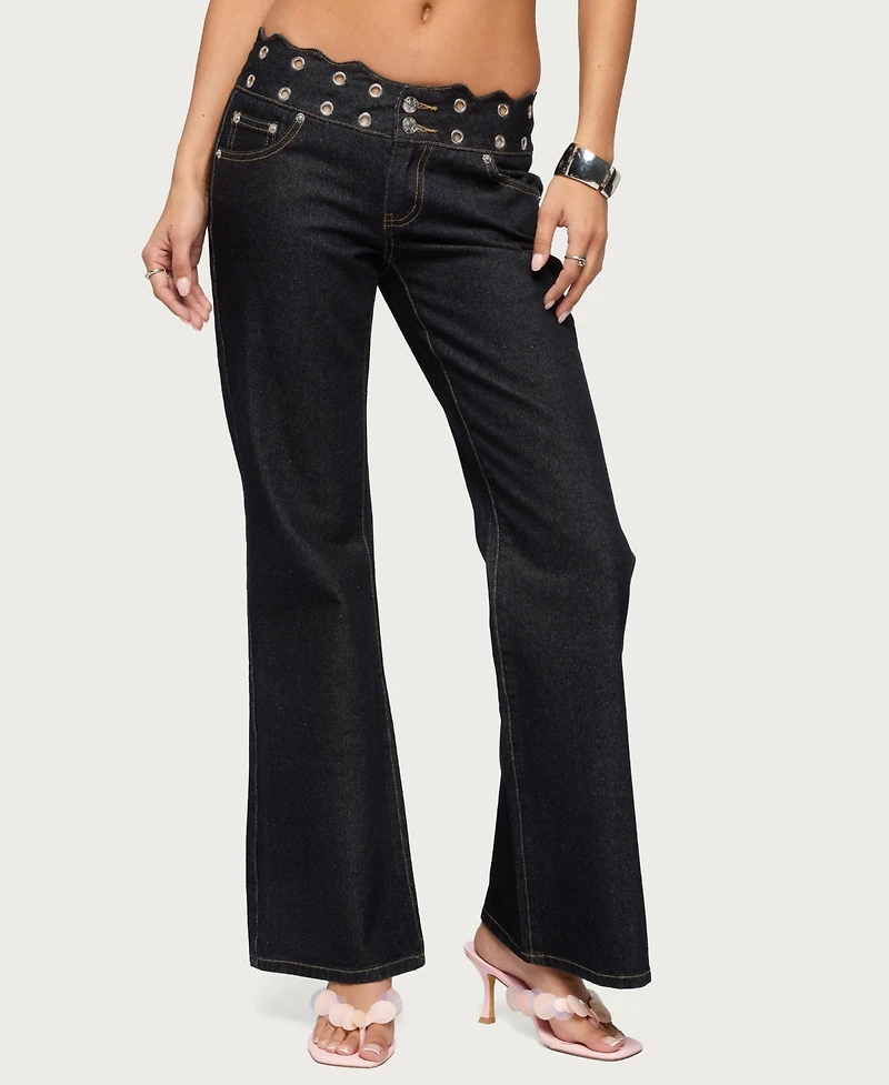 Edikted Women's Scalloped Grommet Low Rise Bootcut Jeans