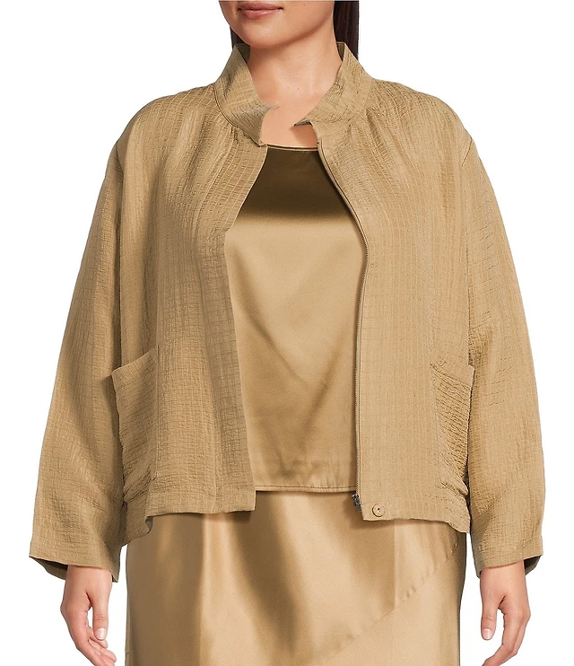 Eileen Fisher Plus Silk Linen Stand Collar Long Sleeve Box Jacket