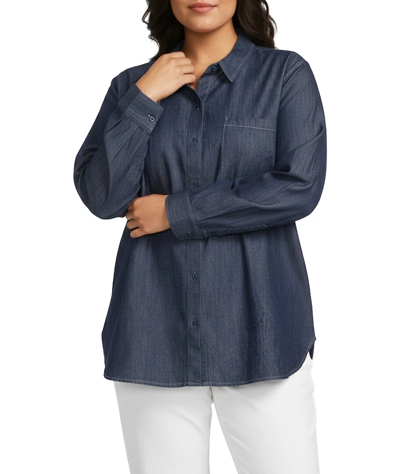 Eileen Fisher Plus Size Lightweight Organic Cotton Denim Point Collar Long Sleeve Shirt