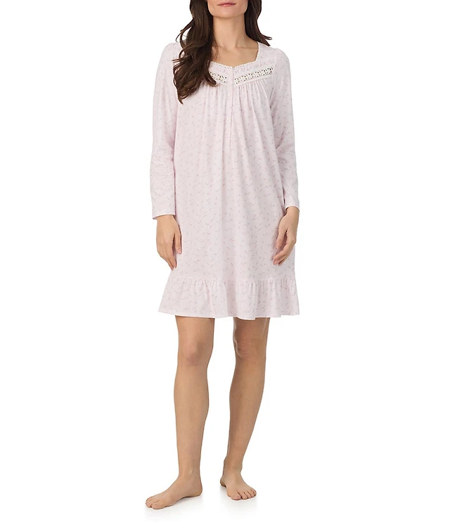 Eileen West Long Sleeve Sweetheart Neck Cotton Jersey Knit Ditsy Floral Short Nightgown