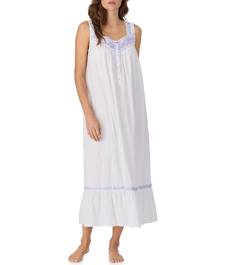 From Eileen West, this nightgown features: Woven lawn fabrication Sweetheart neckline with delicate floral embroidery Sleeveless Partial button-front closure Floral embroidery at the hem Ruffled hem Pullover construction Approx. 50" length Cotton Machine wash cold/tumble dry low Imported.