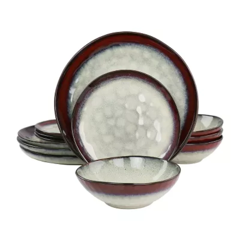 Elama samara 12-piece stoneware dinnerware set in red, and taupe is ideal for everyday use. Textured design is also great for when you are expecting guests to add a little style to your table setting, off round shape and subtle brown rim also adds a little charm. Constructed of sturdy stoneware, this set can be microwaved and used in the dishwasher time and time again.