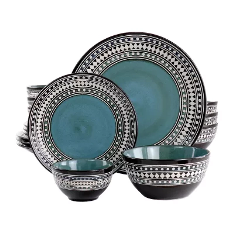 Add a beautiful splash of color with the Elama blue sage 16-piece double bowl dinnerware set. Features a beautiful geometric rim and vibrant center, this set is perfect for everyday use. Constructed of stoneware, dinnerware is microwave and dishwasher safe.