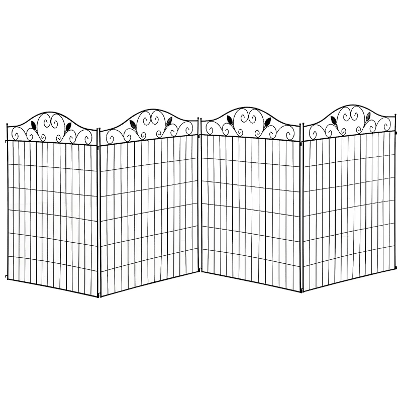 Elegant vine-patterned yard fencing with adjustable angles for versatile shapes (I, L, wavy). Easy installation without tools, provides a safe barrier for pets. Overall size: 143.75" L x 44" H.