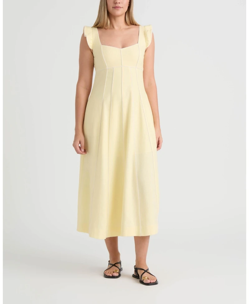 Elegant and airy, this linen dress features a sweetheart neckline, ruffled sleeves, and a softly flared hem. Shaped with an empire bustline and finished with contrast piping, it offers a feminine, tailored charm.