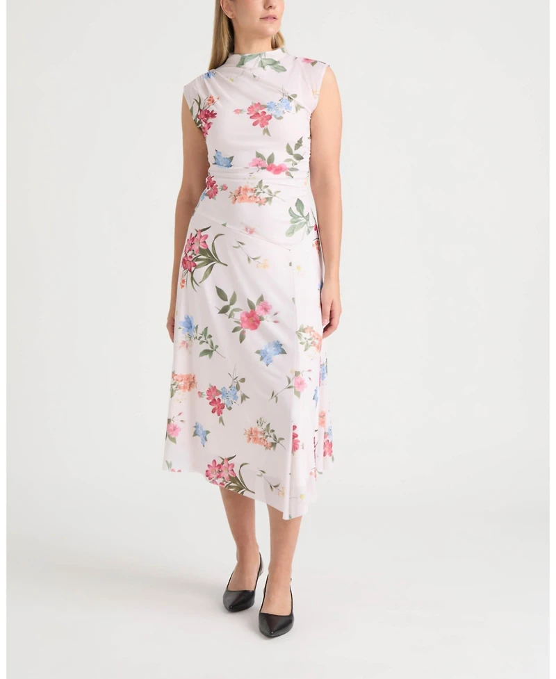 Sophisticated and feminine, this sleeveless mesh dress features a mock neckline, floral print, and side shirring that flatters the silhouette. Finished with a handkerchief hem, it is sure to be a standout piece in your everyday wardrobe.