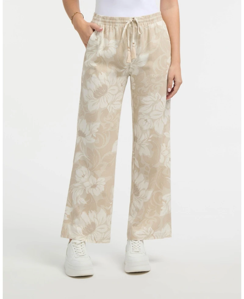 Go with the flow in these breezy linen blend wide leg pants. They feature a comfortable pull-on elastic waistband, inseam pockets and adjustable strings with beads and tassel details for a fashionable touch.