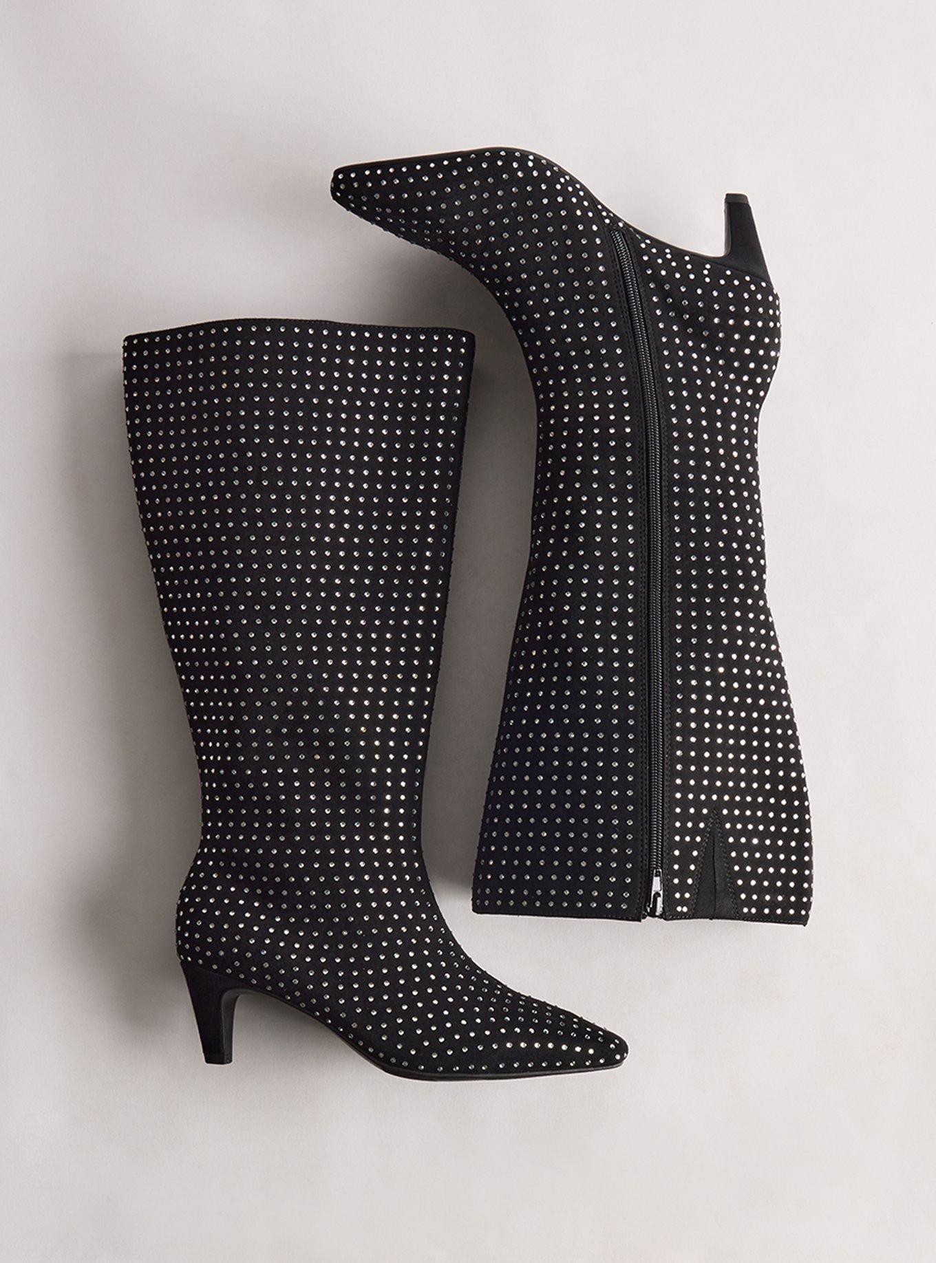FIT Heel height: 2.5'' Shaft height: 15'' Extra wide width (WW): Our unique fit gives you extra wide width and extra room around your whole foot. Extra cushioned footbed. MATERIALS + CARE Man-made materials. Imported. DETAILS Pointed toe. Kitten heel. Rhinestone upper. Wide Calf Calf fit by size: 6 : 17.0'' 6.5 : 17.2'' 7 : 17.5'' 7.5 : 17.7'' 8 : 18.0'' 8.5 : 18.2'' 9 : 18.4'' 9.5 : 18.7'' 10 : 18.9'' 10.5 : 19.2'' 11 : 19.4'' 11.5 : 19.6'' 12 : 19.9'' 12.5 : 20.1'' 13 : 20.4''