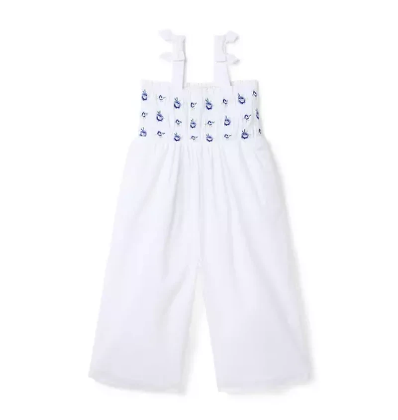 Breeze through sunny days in our wide leg jumpsuit. Designed with embroidered florals, smocked details and bows at the straps. 100% Cotton Batiste; Lining: 100% Cotton Fully Lined Sleeveless Snaps At Inseam (Sizes Up To 18-24M) Online Exclusive Machine Washable; Imported