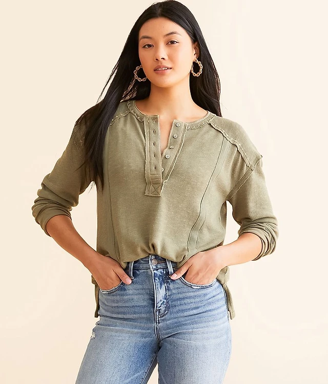 Reba Sedona Scoop Neck Long Sleeve Embroidered Henley Tee