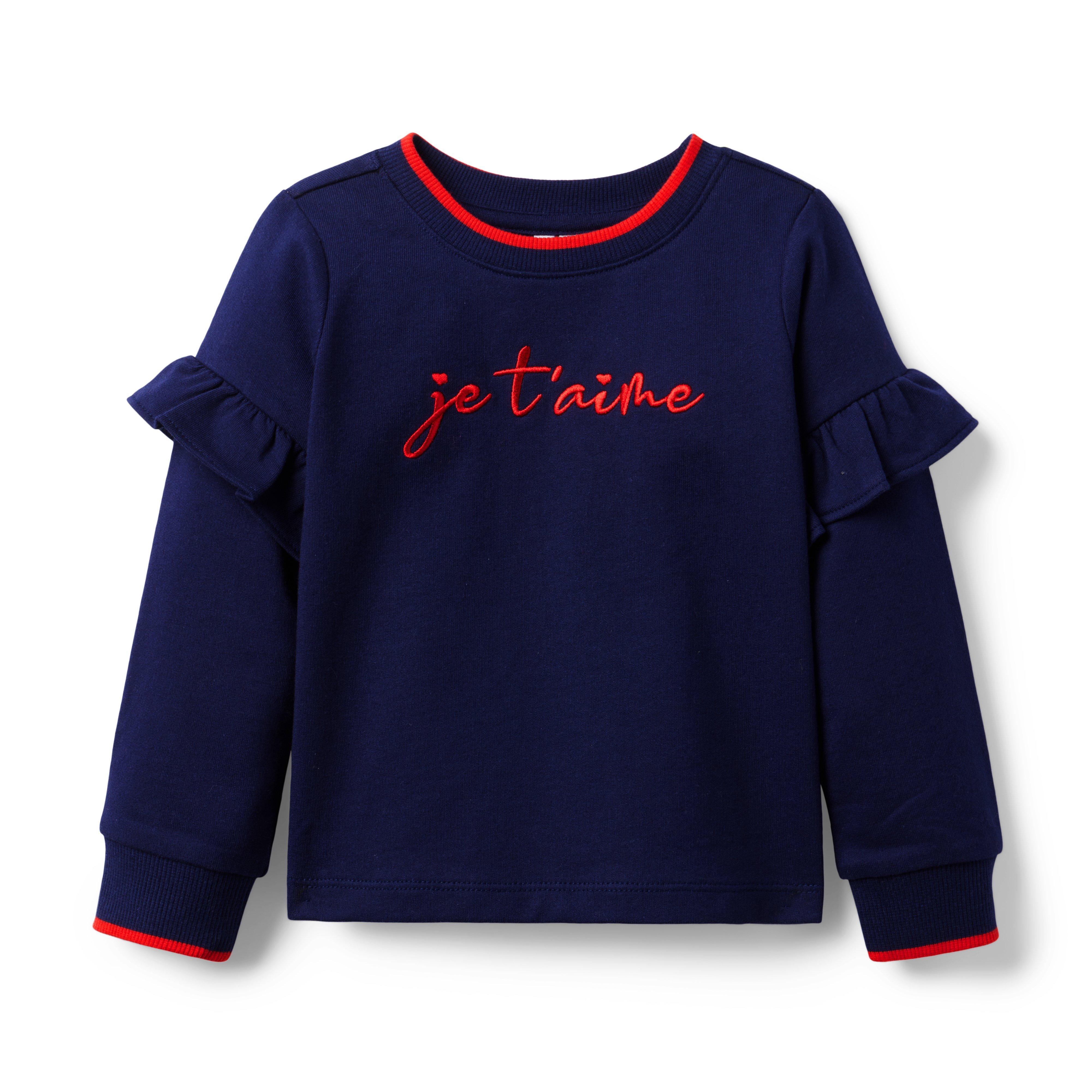 Our cozy sweatshirt is sure to win hearts. Made in soft French terry with details to love, like ruffle sleeves, contrast tipping and an embroidered "Je T’aime" graphic. 100% Cotton French Terry Long Sleeve Online Exclusive Machine Wash, Gentle Cycle; Imported