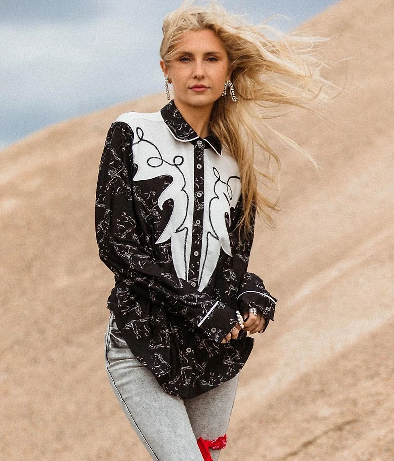 Horse printed button down blouse Bust measures 39" on size small Body length 25" on size small