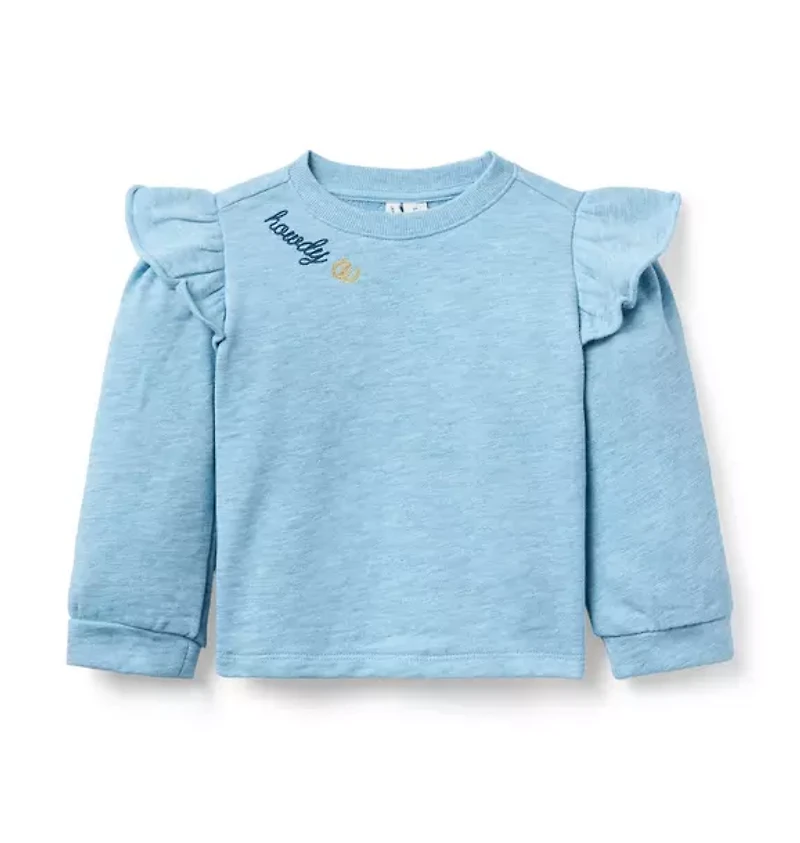 Give a warm welcome to our sweatshirt in soft French terry. Featuring an embroidered Howdy detail at the neck, ruffles at the shoulder and ribbed details. 60% Cotton French Terry/40% Polyester Long Sleeve Machine Washable; Imported