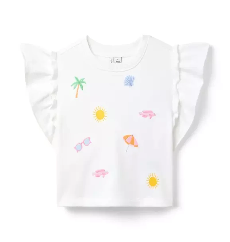All the island vibes for our top in soft French terry. With embroidered tropical icons, ruffle sleeves and a ribbed neck. 60% Cotton French Terry/40% Polyester Short Sleeve Machine Washable; Imported
