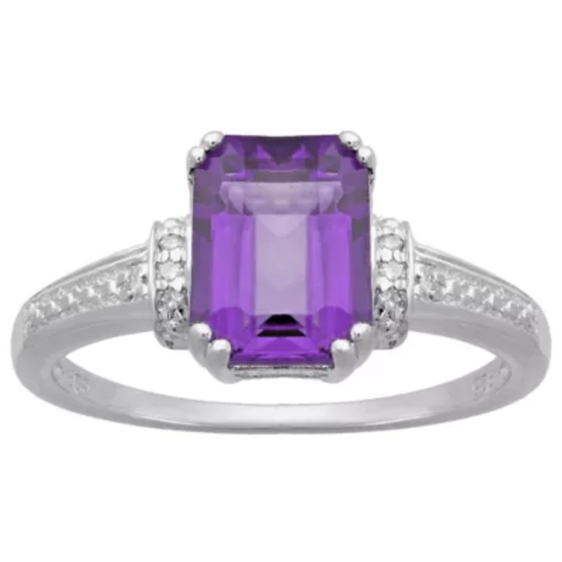 Designed for the modern and fashion-savvy woman, this stunning piece combines elegance and sophistication with a youthful and trendy vibe that will make you stand out from the crowd. Crafted from 10K white gold, this ring is the epitome of luxury and refinement. The smooth, polished finish adds a touch of glamour, while the durable construction ensures that this piece will last for years to come. The 8x6mm emerald cut stone at the center of the ring is truly mesmerizing, with its deep colorful hue and brilliant sparkle. This stunning gem is complemented by delicate diamond accents, adding a touch of glamour and sophistication. Perfect for everyday wear or special occasions, this birthstone ring will enhance any outfit and make a statement. 3 Color rating: I, H Clarity rating: I2I3 Polished finish Prong setting China Imported Product Specifications 8mm 1.71 Material & Care Metal, White gold Use gold polishing cloth on gold items.