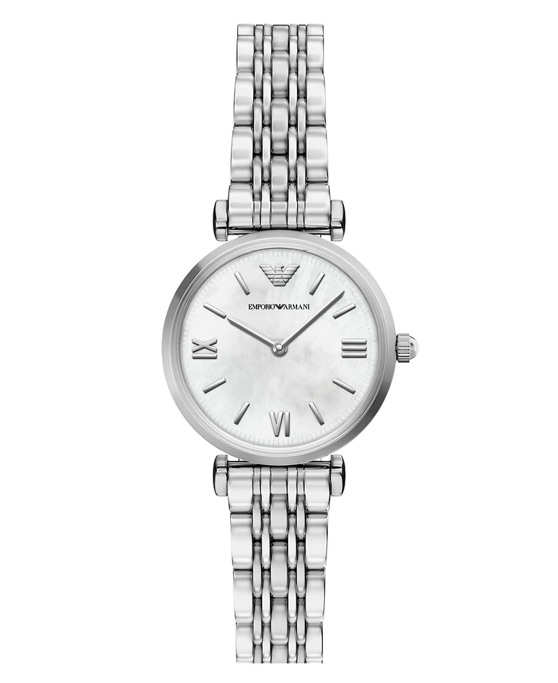 Emporio Armani's 28mm stainless steel watch with a two-hand movement showcases a white mother-of-pearl dial with a textured edge. Adorned with Roman numeral indexes and a 7 link bracelet, this watch is an elegant complement to any collection.