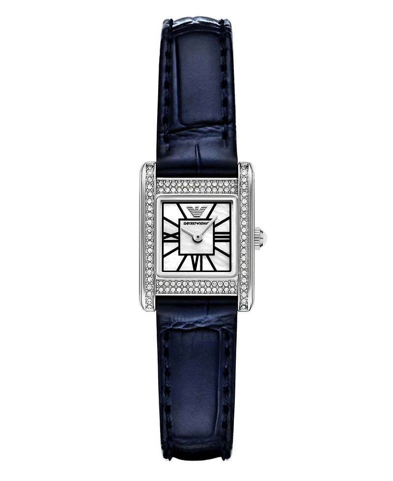 Emporio Armani's 20 x 26mm watch showcases a white mother of pearl dial with Roman numeral indexes in a stainless steel case with crystal embellishment. The deep blue, crocodile patterned leather strap ensures a refined look for your collection.