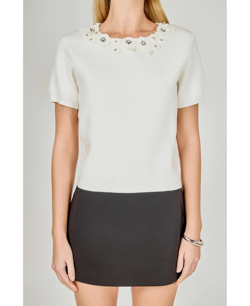 endless rose Women's Floral Detail Short Sleeve Sweater