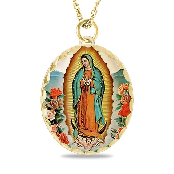 Engravable Enamel Our Lady of Guadalupe Oval Pendant in 10K White, Yellow or Rose Gold (1-2 Lines)