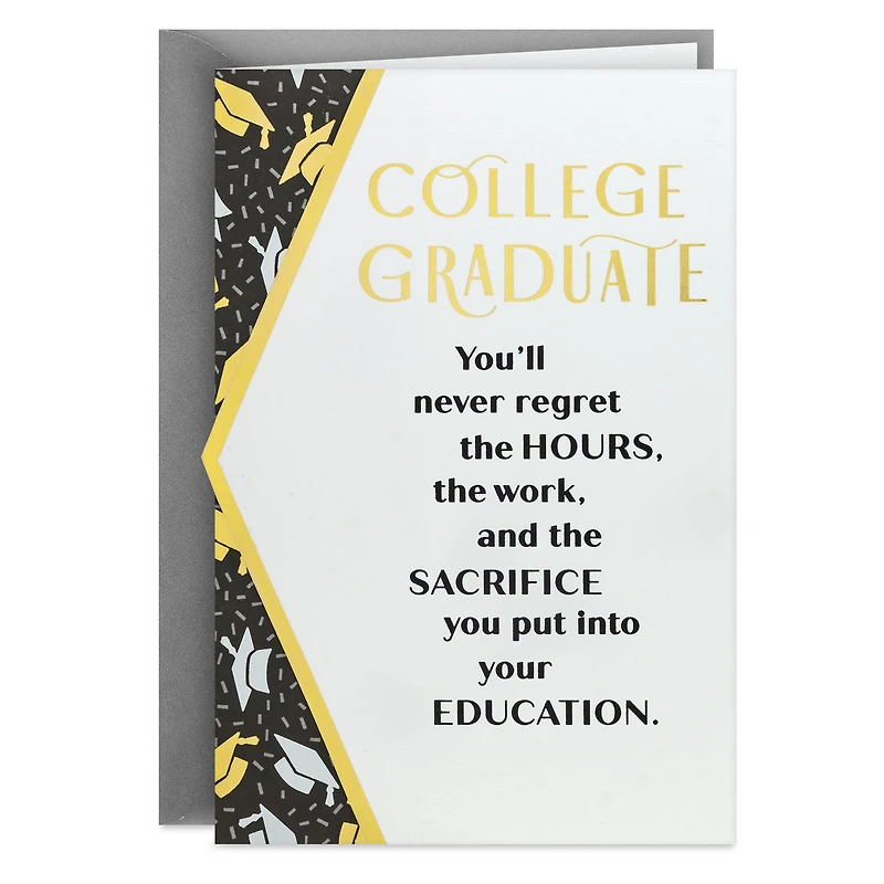 College graduation greeting card features a black geometric edge with scattered gold and silver mortarboards beside eye-catching lettering on a confetti-sprinkled white background paired with a message of admiration and enthusiasm for their accomplishment and the future that awaits.