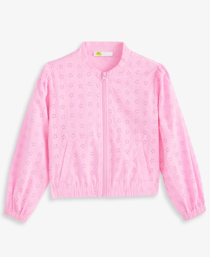 A dainty eyelet design adds pretty style to a classic silhouette for your girl with this cotton zip-up bomber jacket from Epic Threads.