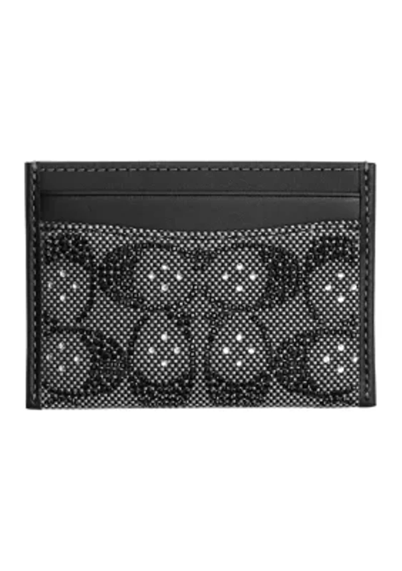 Carry your essentials in style with this compact leather card case from COACH. Signature jacquard and glovetanned leather Five credit card slots 4 1/4" (L) x 3" (H) Five credit card slots Imported Material & Care Leather Spot clean only