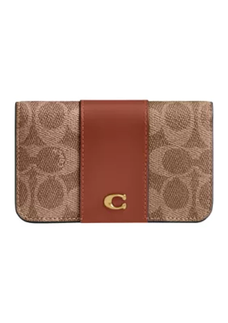 This compact card case, crafted from durable coated canvas and refined calf leather, is designed for the modern woman. Its compact size, measuring 5 inches in length, 3.5 inches in height, and 1 inch in width, makes it easy to carry in your pocket or purse. With four credit card slots, inside open pockets, a zip coin pocket, and an outside open pocket, this card case keeps your essentials organized and easily accessible. Imported Product Specifications 5" L x 3.5" H x 1" W Material & Care Leather Spot clean only