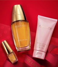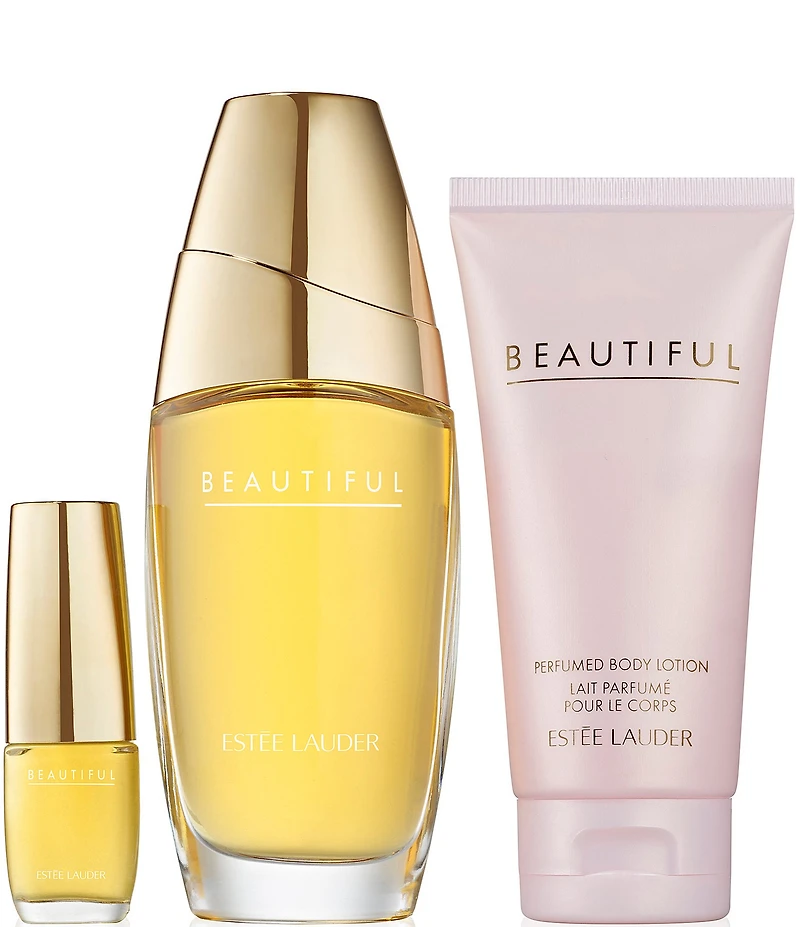 Unwrap the joy of Beautiful—the fragrance of a thousand flowers. A rich blend with notes of Rose, Lily, Tuberose and Orange Flower. Brightened with citrus, warmed by woods. Luxurious, yet lightweight, the Perfumed Body Lotion slips on easily, absorbs quickly. Leaves skin feeling moisturized, smooth and silky. Make all her days Beautiful, at home or away. Limited-time collection includes: 2.5-oz. Beautiful Eau de Parfum Spray, full-size 2.5-oz. Beautiful Perfumed Body Lotion, deluxe travel size 0.16-oz. Beautiful Mini Eau de Parfum Spray, deluxe travel size Top Notes: Rose, Mandarin, Lily, Tuberose, Marigold Middle Notes: Orange Flower, Muguet, Jasmine, Ylang-Ylang Base Notes: Sandalwood, Vetiver, Amber $144 Value!